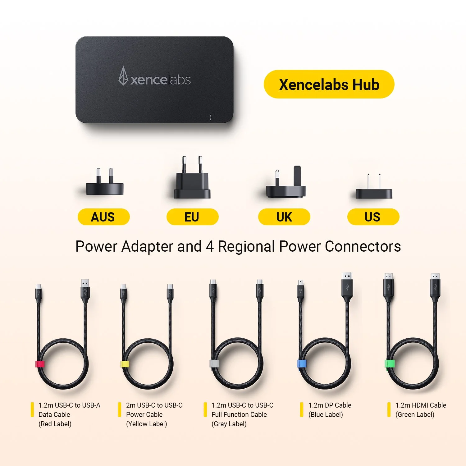 In the very bottom of the box are the power adapter plus various regional plugs as well as more cables which you use with the hub. These include a Display Port to mini Display Port, HDMI cable, two USB-C to USB-A cables and two USB-C to USB-C cables.