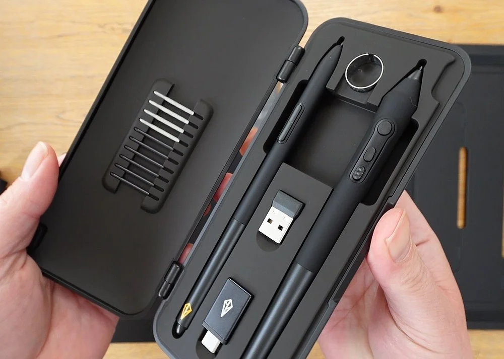Xencelabs are very generous when it comes to pens, and with each device, they give you both a slim pen, and a thicker three button pen. Both also have erasers on the end, and they come in a handy carry case. Inside here you will also find the dongle for the Quick Keys remote.